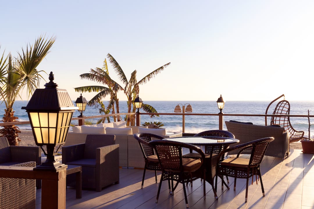 海が見えるテラス席、こだわりの内装、旅の思い出になるような看板メニューの写真を大きく配置し、非日常感を演出します。